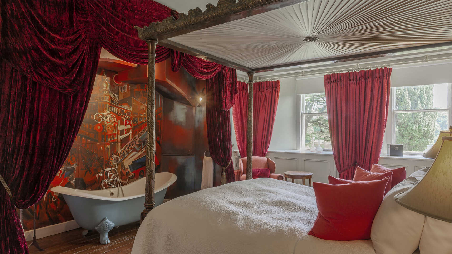 The beautifully-unique interior gives way to surprising features and stunning design elements, from the almost fully-glazed conservatory to the storytelling wall murals, sculpted mirrors and grand piano. Each room is a carefully-curated character in itself brimming with colour, warmth and decadence.