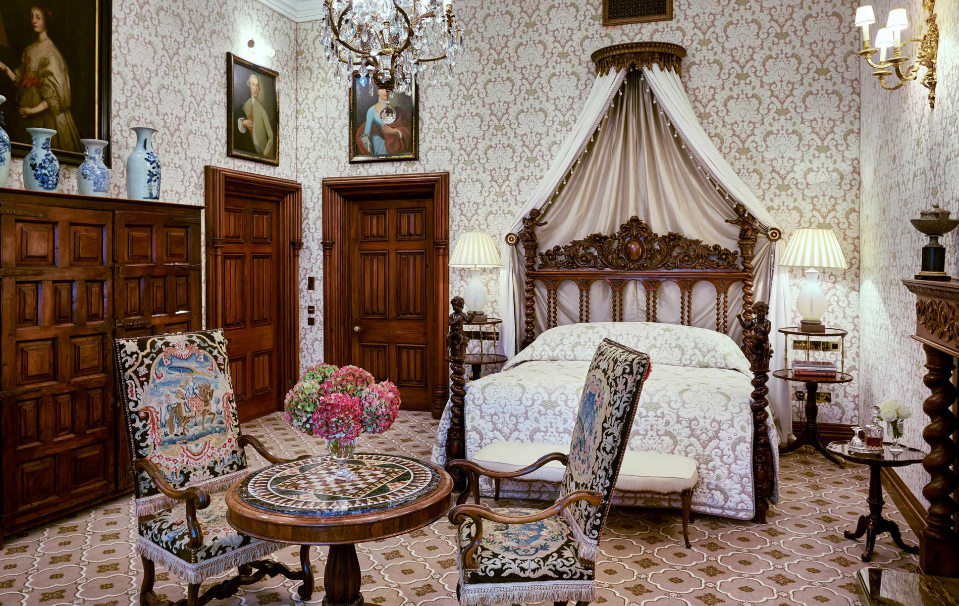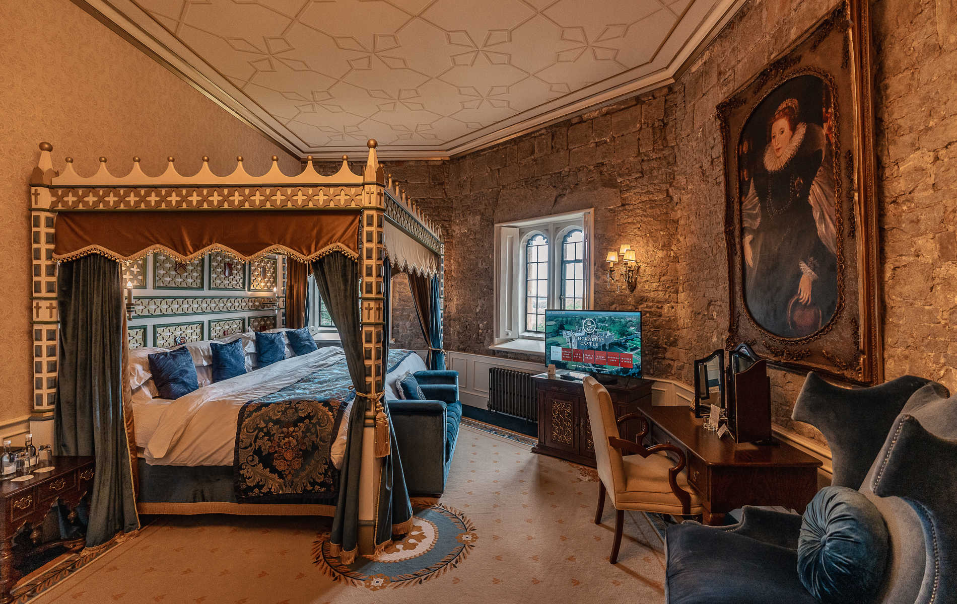 The Tower Suite has one of the largest beds in the UK. All of the individually-styled bedrooms are fit for royalty, displaying iconic period detail and rich colour Imperial prints across flooring, fabrics and walls. Downstairs, Tudor opulence adorns every room; embellished mirrors, picture frames and occasional furniture complement the exposed stonework and dark wood panelling backdrop.