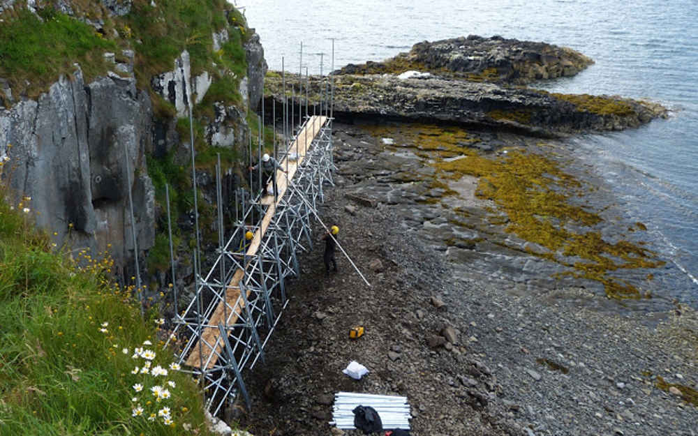 By this morning the scaffolders were working their way around to the west wall, and beginning to find solutions to the multiple problems of erecting scaffolding on the Mingary Castle site. They were able to put the base of the scaffolding straight onto the limestone of the wave cut platform; this meant that it was necessary to dig out the shingle beach which covered it to expose the rock.