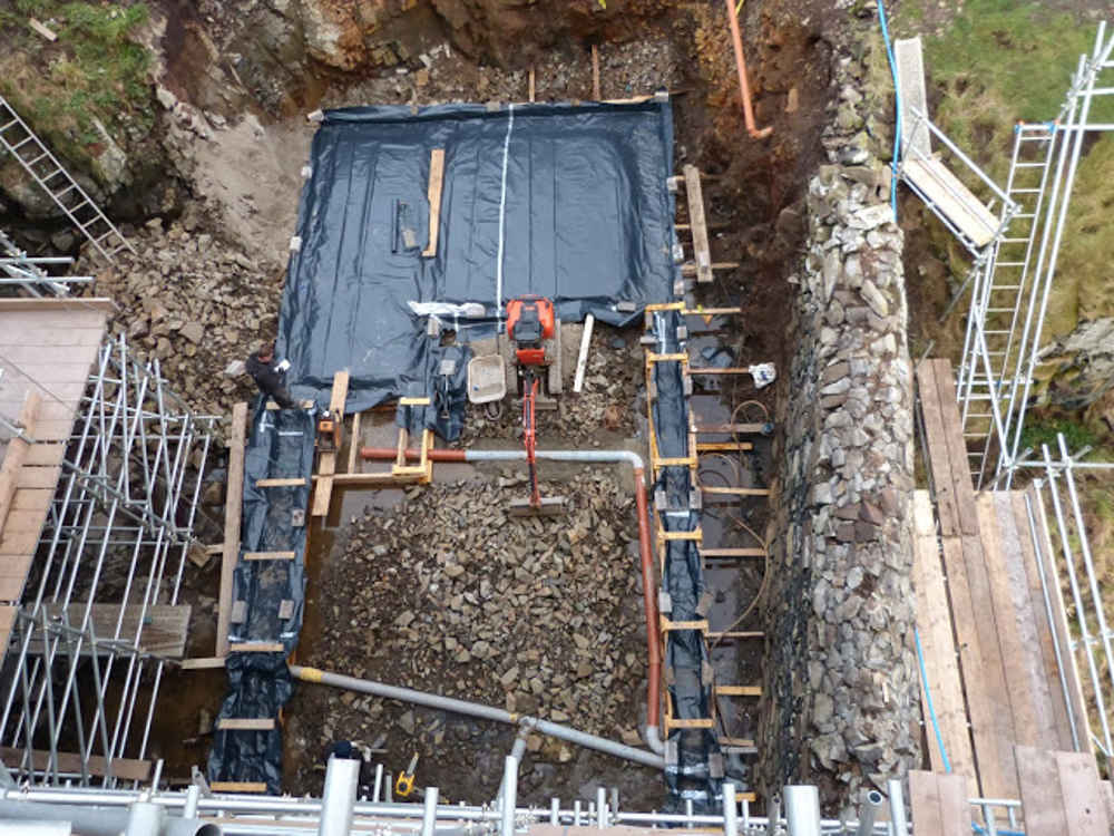 There was plenty of progress to be seen since my last visit. The courtyard drains are largely done, and the upper part terrace isn't far from having its Caithness flags laid, but the main progress has been is a small, underground room off the courtyard.