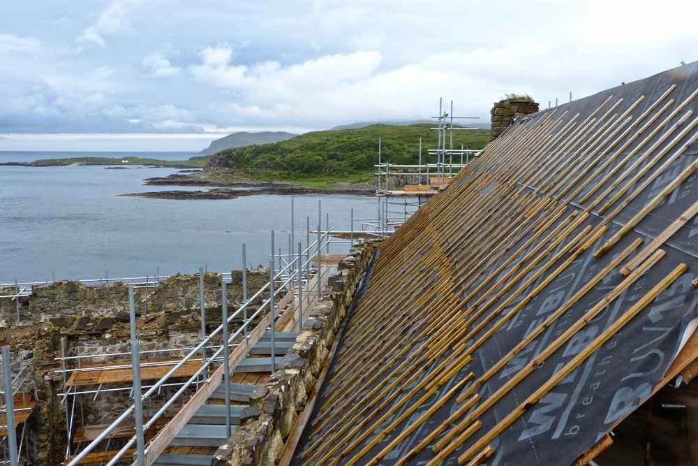 Having been away from Kilchoan for a few days, I set off for the castle this morning with some excitement, as things have been moving forward very quickly recently - but I hadn't expected the progress I found: the roof structure on the north range, the main building within the courtyard, is almost complete, and will be finished by Thursday.