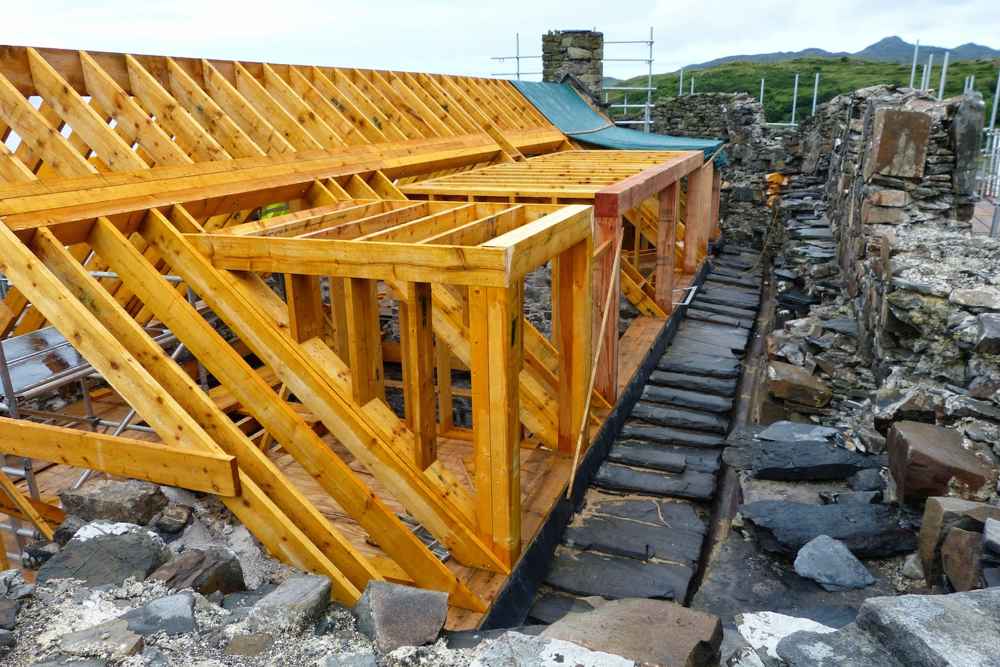 Stonemason Damien, working on the interior gable, has cut through the roof timbers and is completing the chimney.
