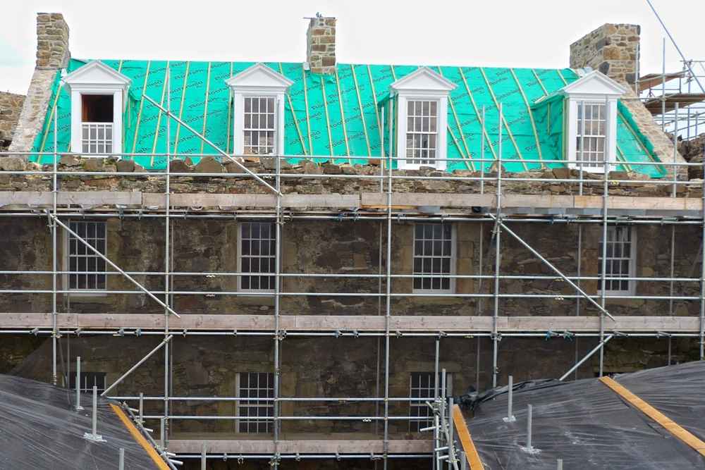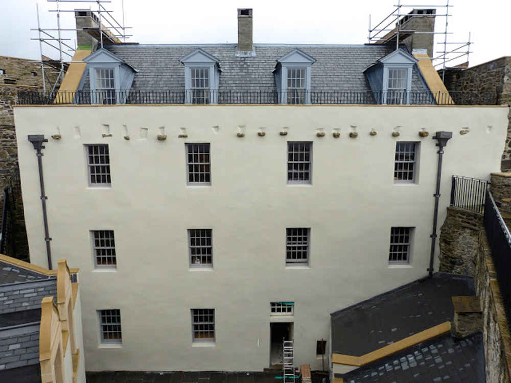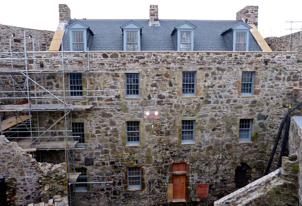 Looking from the ferry terminal one can see that, on the south side, the scaffolding is right down to sea level, and people waiting for the ferry can now see the attic rooms of the north range, with their four dormer windows, protruding above the level of the battlements.