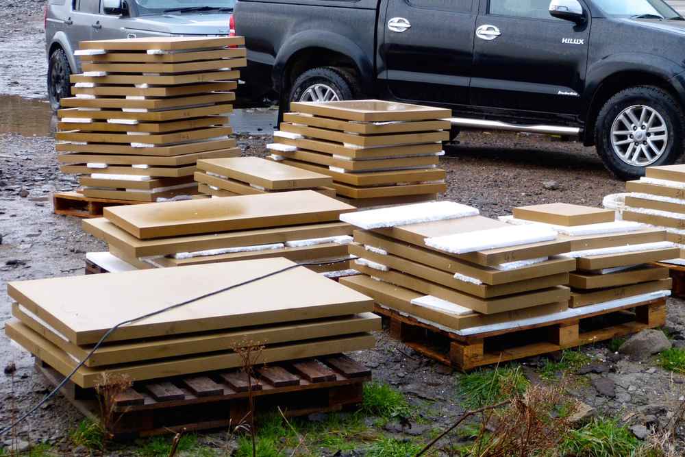 A couple of weeks ago pallets of York stone slabs arrived on site to be cut for the coping stones on top of the battlement walls. They came in several standard sizes, which were then cut and shaped by the stonemason. To do this, he had to climb up to the battlements and make a template for each piece, since very few would conform to a standard size.