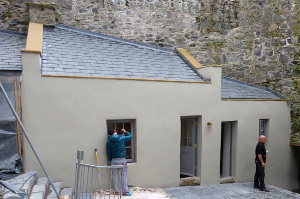 Over the last few weeks a transformation has been taking place within the castle. It's part of what is so exciting about the concept behind the refurbishment of this magnificent 13th century Scottish building - that the bare, formidable exterior which, other than the crenelated battlements and the protruding chimneys, is little changed from how it would have looked 700 years ago gives way on the interior to an 18th century dwelling, a place of which a contemporary country laird would have been comfortable in and proud of. So the walls of the three buildings have been harled, and the effect as one walks into the courtyard is magical. The place is lighter, and there's a softness which contrasts with the bare rock interiors of the great curtain walls which rise above the buildings.