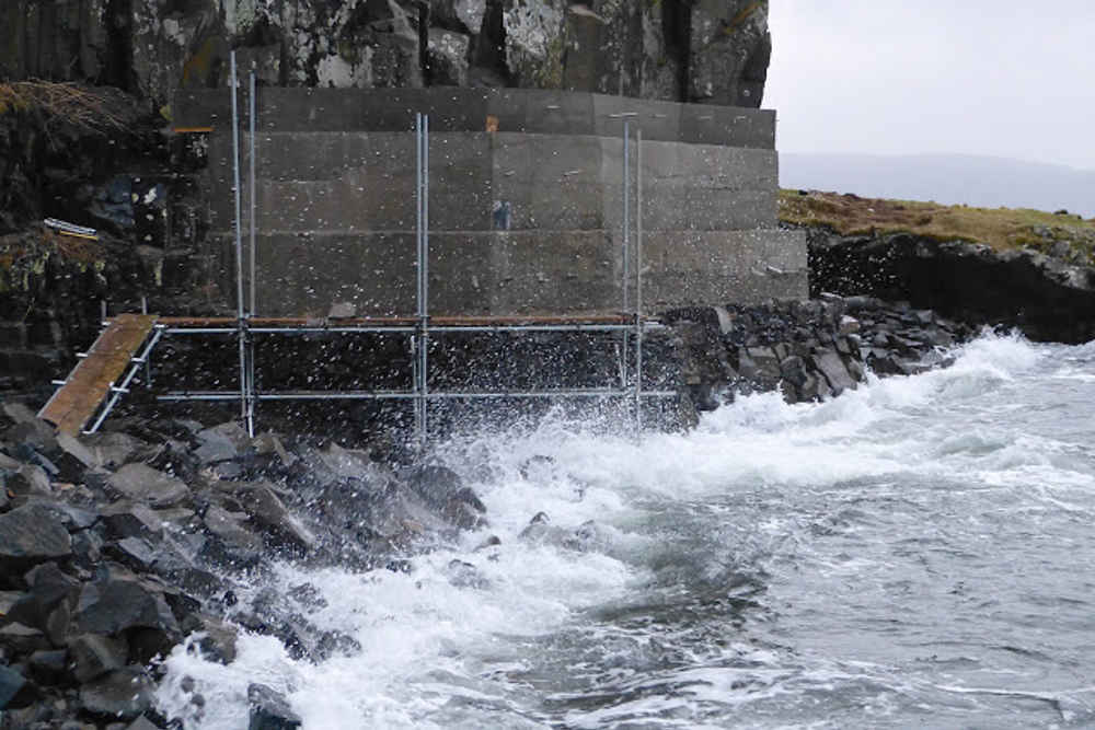 The great curtain walls of Mingary Castle are on the point of collapsing because the rock on which they are built, a very hard granophyre, is breaking into blocks which are falling. To stop this happening - and it might happen at any moment - the blocks have to be pinned back in place.