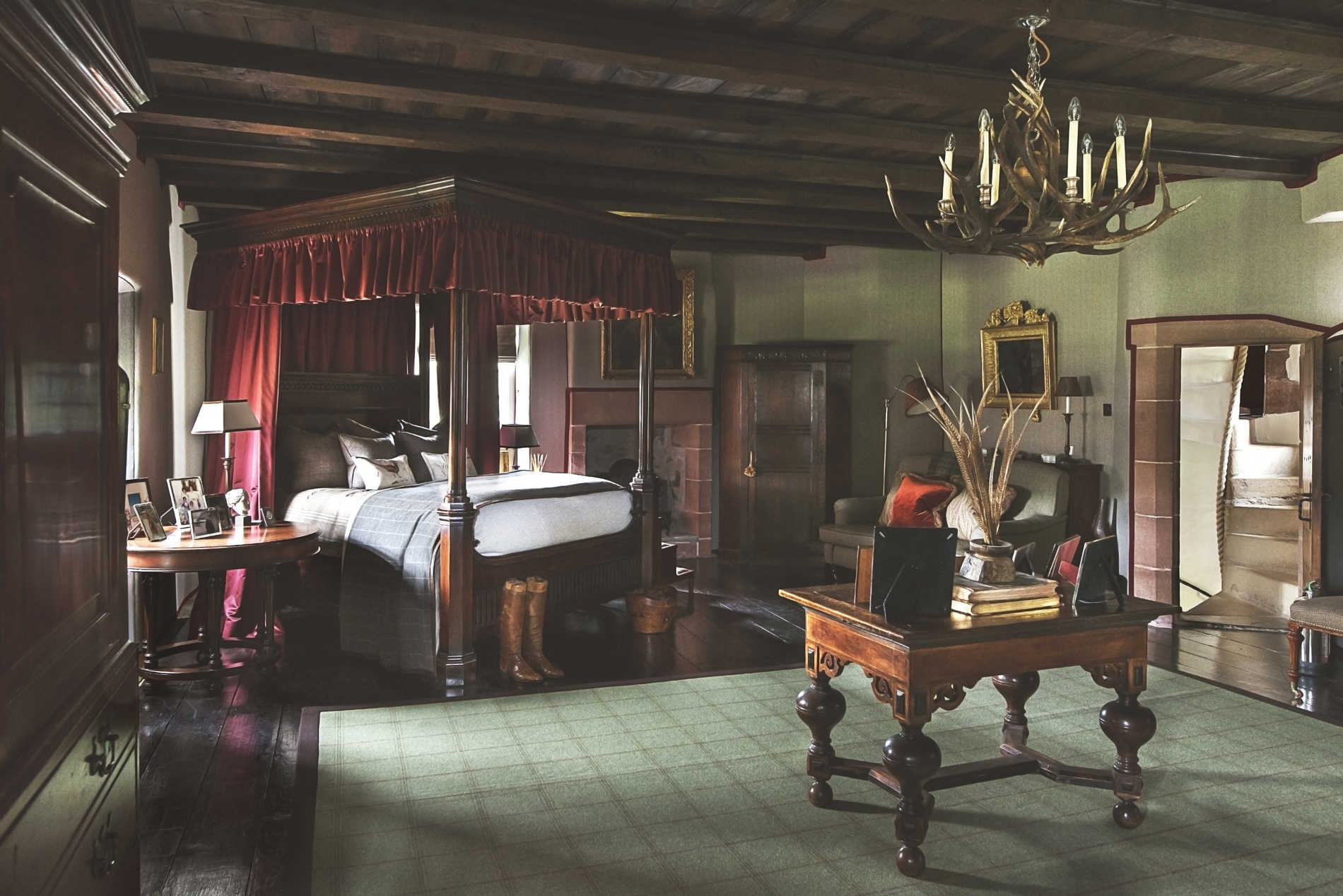 This castle's most superior bedroom features a king-size, four-poster Ralph Lauren bed, large sofa and open-plan bathroom with roll-top bath and free-standing brass Drummonds shower. It is also a favourite abode of Julie at Celtic Castles for its beautiful red drapes overhanging the four-poster bed - which requires a step up as it is so high - its dark wooden beamed ceilings, deep stone access off a spiral staircase and authentic Scottish feel.