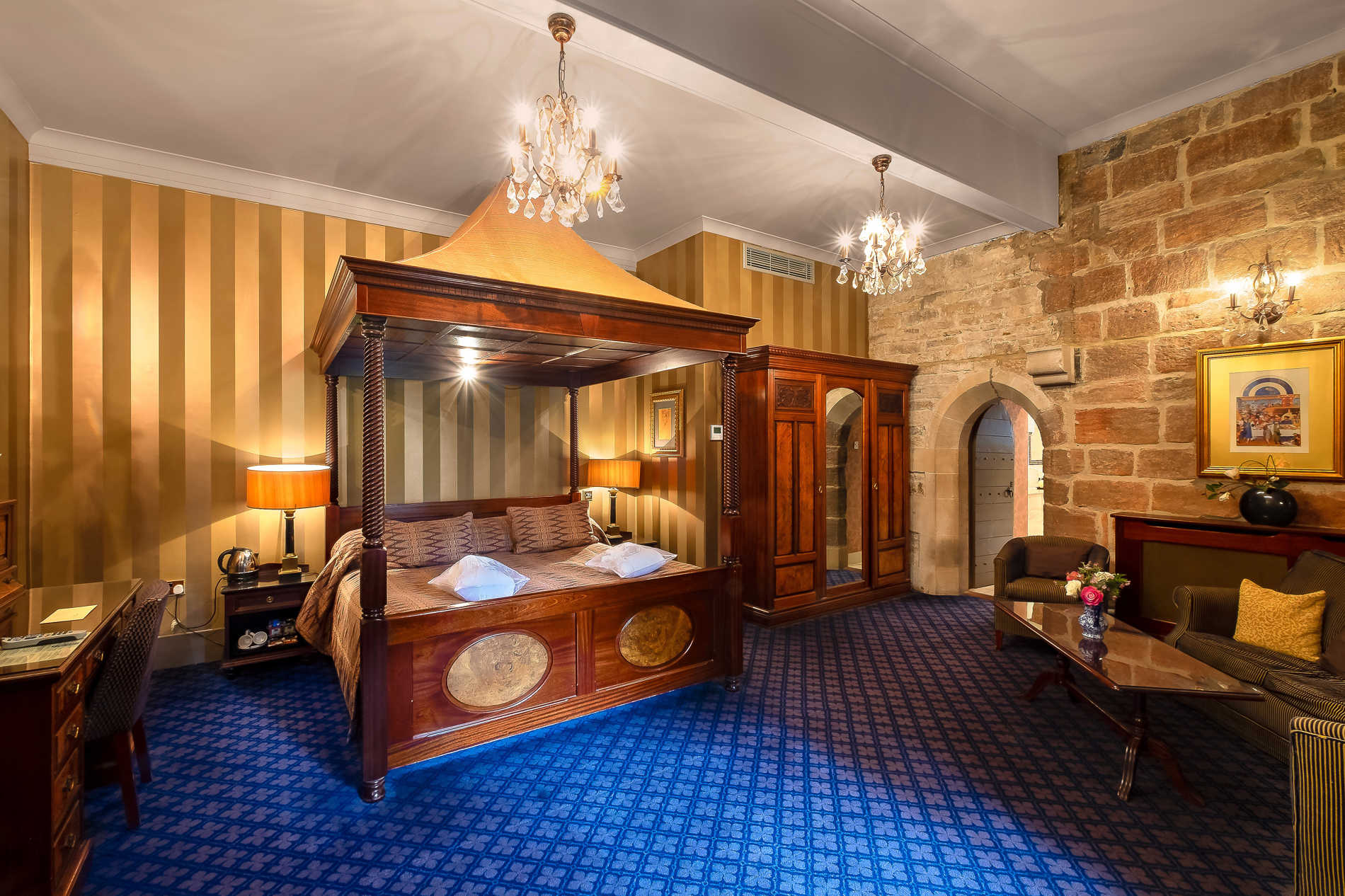 In this extravagant suite you’ll admire 24-carat guilding, sumptuous Tudor furnishings in regal golds and velvet blues that, set against rustic exposed stone walls, will take you back in time to a world of regality and splendour. The imposing four-poster with its Imperial crown-like top is every bit as ornate and majestic as a wife of Henry VIII.