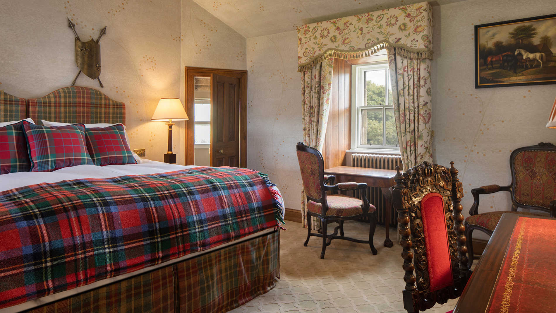 As delicious as it is famous, this wonderful bedroom hosted Mary Queen of Scots herself during her castle stay in 1563 and today includes complimentary chocolates and luxurious skincare products for those lucky enough to stay here. Beth at Celtic Castles finds it full of atmosphere and warmth not least created through the huge roaring fire, soft terracotta walls and richly-coloured fabrics and paintings, but also its link to the famous queen known for her charm, beauty and entrancing nature.