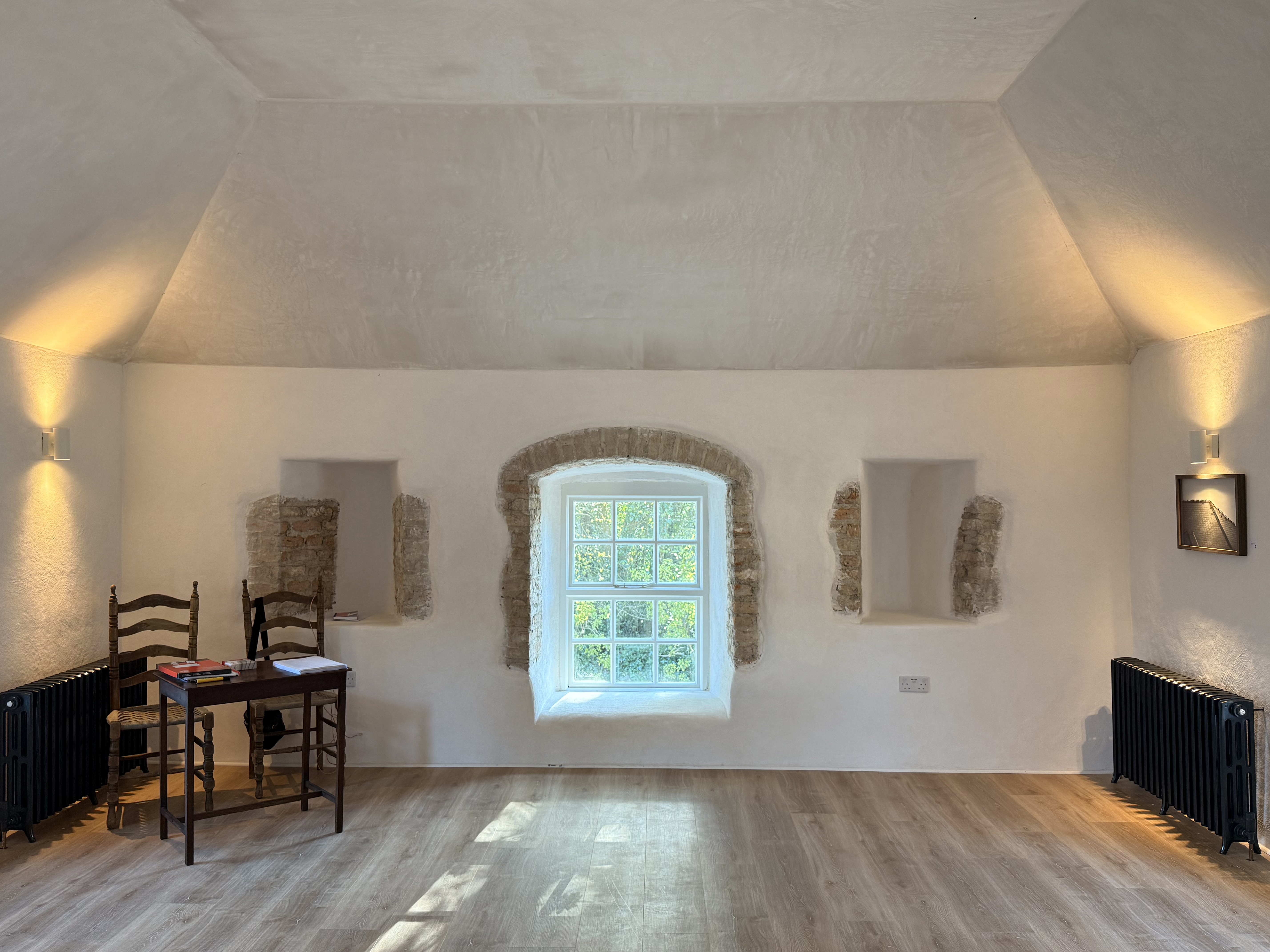 Upstairs, a beautifully restored space with original lime plastered walls provides a striking canvas for exhibitions and product launches.