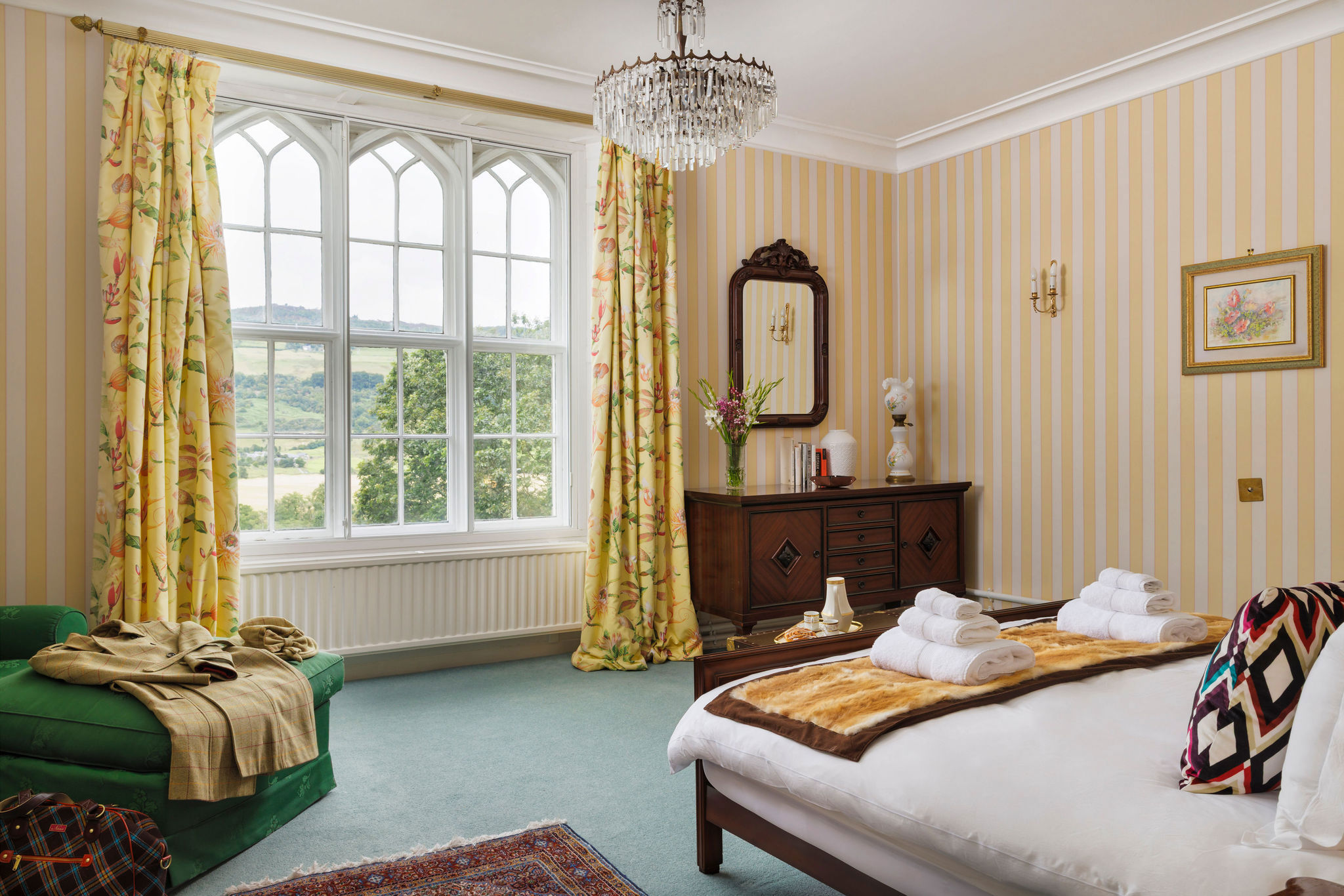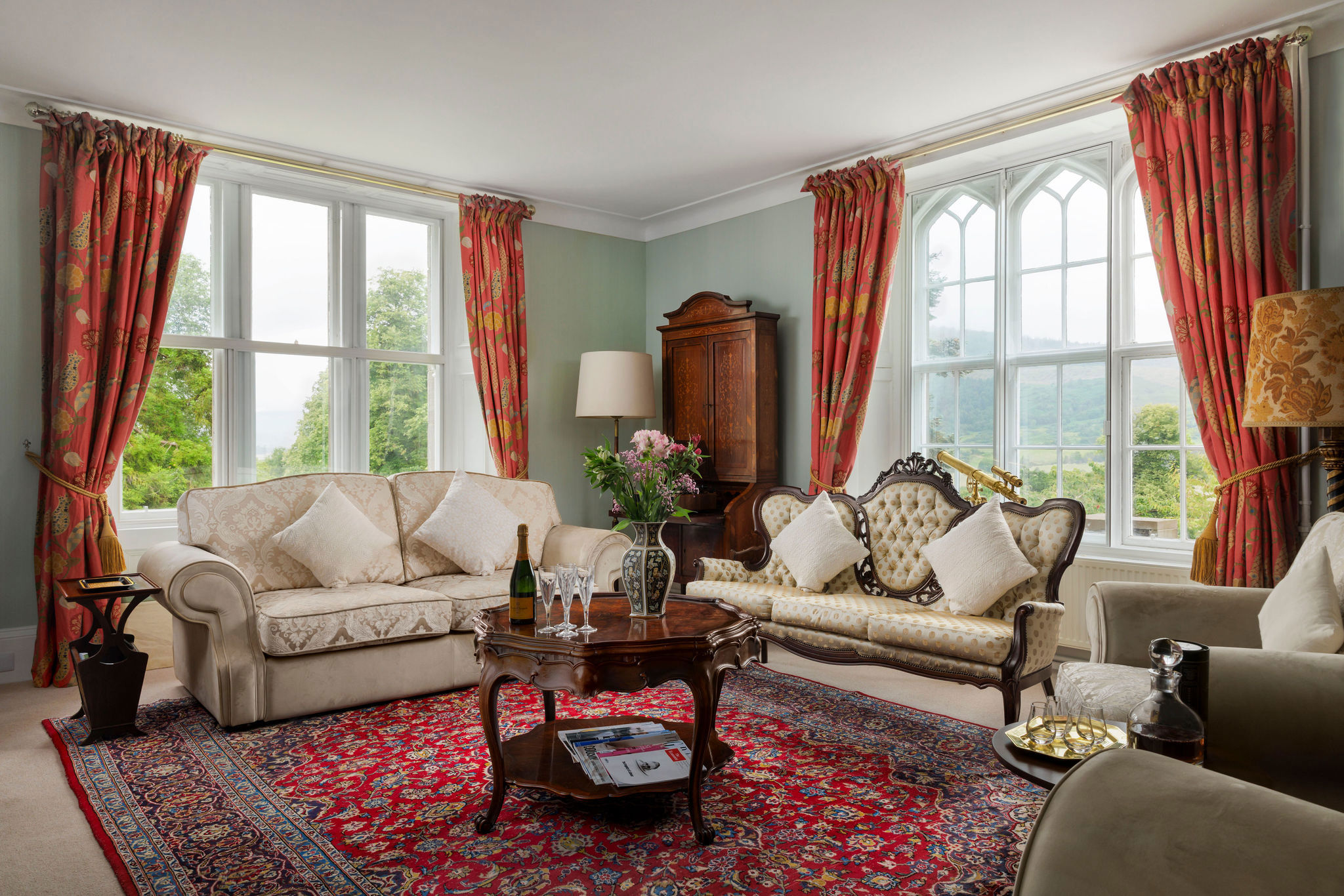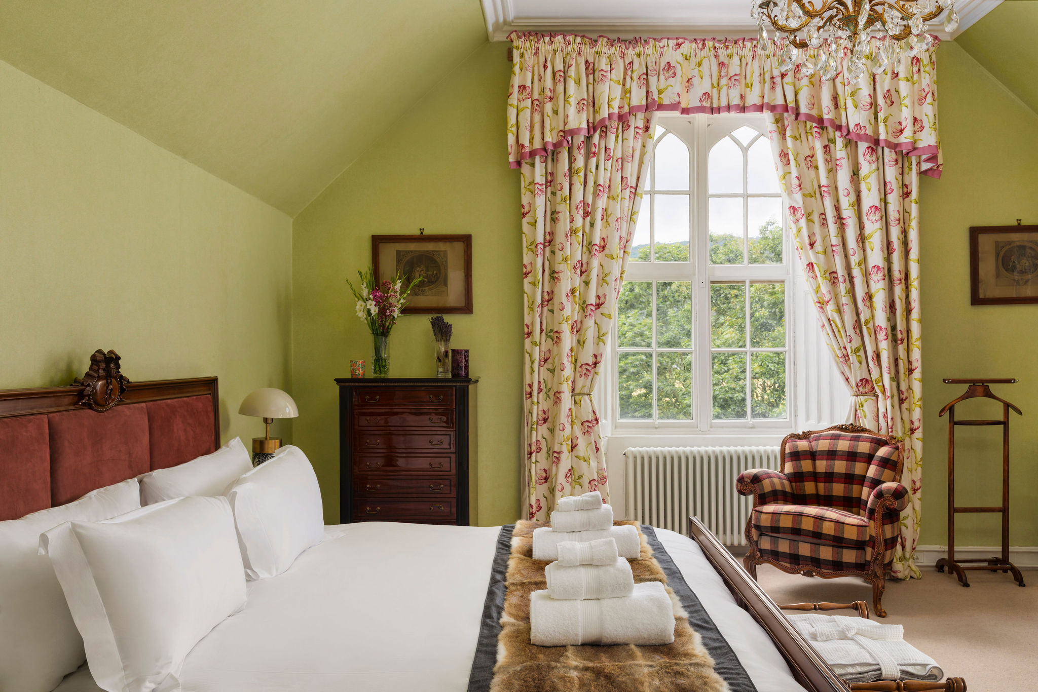 Situated within glorious, lush gardens, outside the small market town of Aberfeldy, the charming Bolfracks sits prettily on the banks of the River Tay. Its hillside grounds cocoon the white-washed, grey-fringed property and look out over the beautiful majestic landscape of the Tay Valley as its flat farmland and rugged forested hills change with the seasons.
