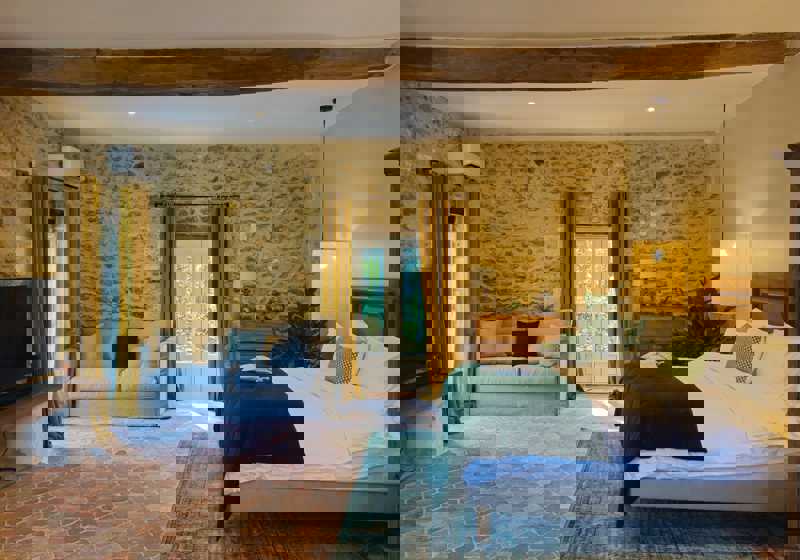 The château features 4 bedrooms, each with a king-size bed. Additionally, the outbuildings include several cottages that can accommodate a further 10 guests, in 5 bedrooms.