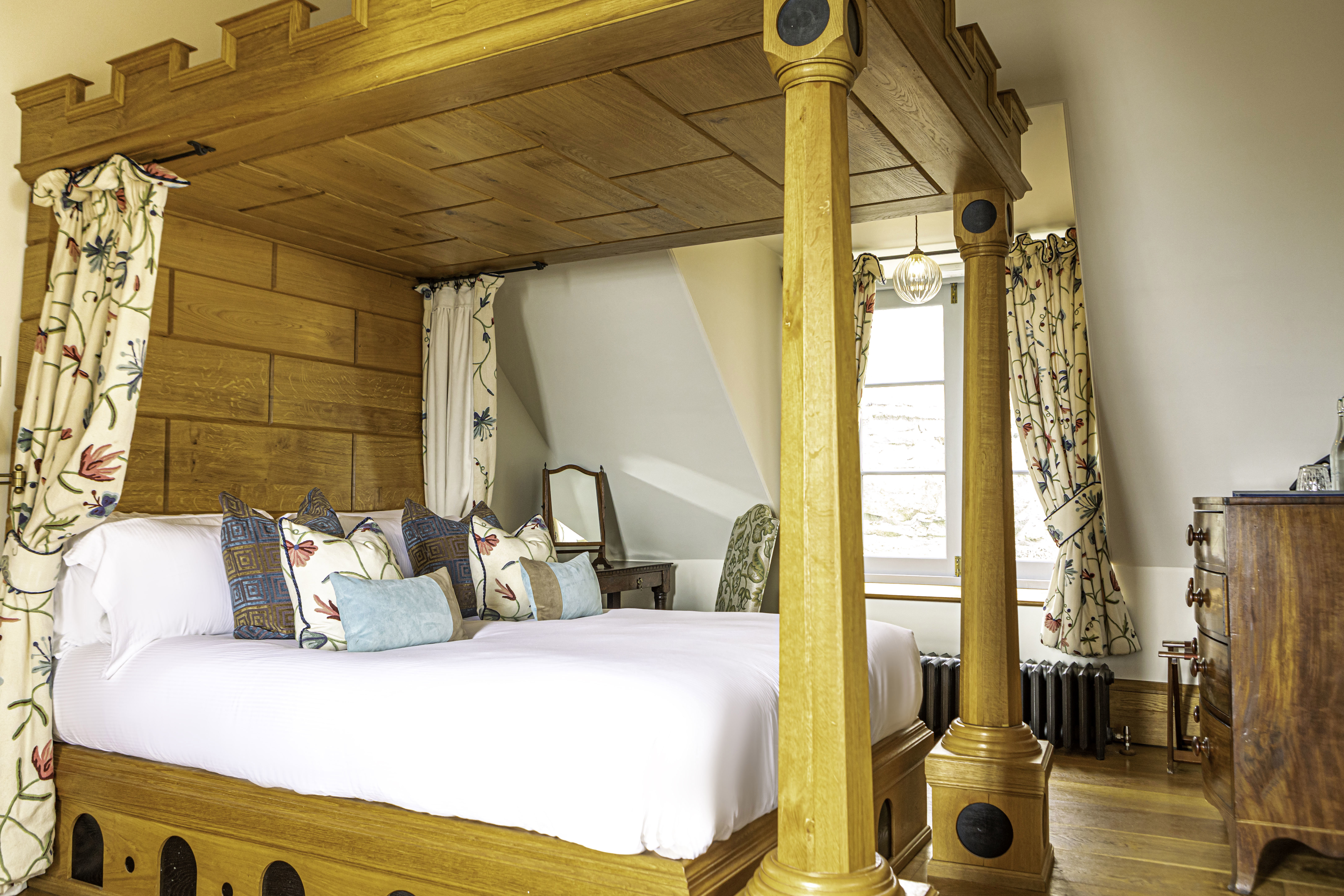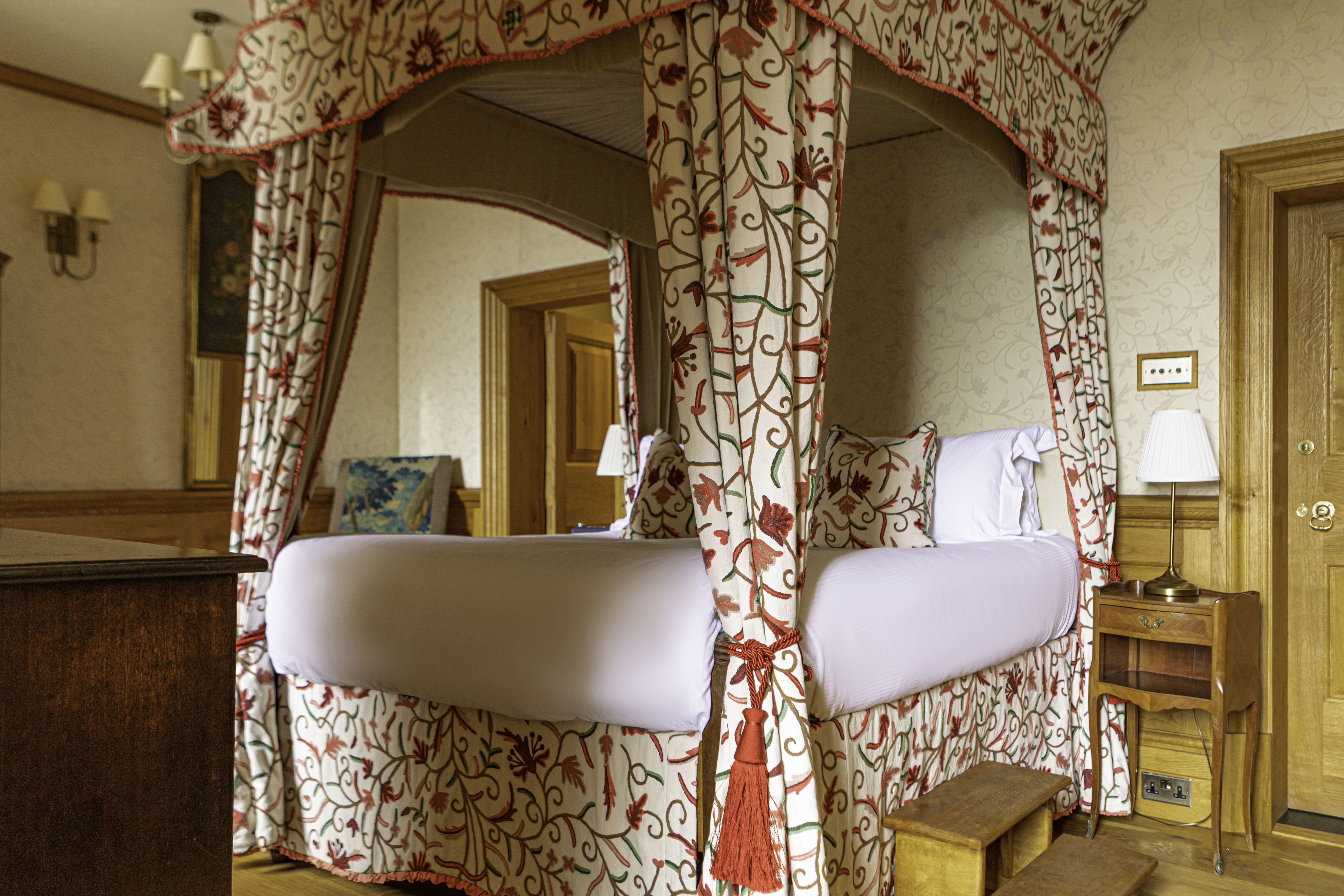 Nestled on the second floor of the castle’s North Range, the MacDougall Suite’s hand-sewn crewel-fabric-lined walls host a beautiful four-poster double bed and range of refined antique furniture.