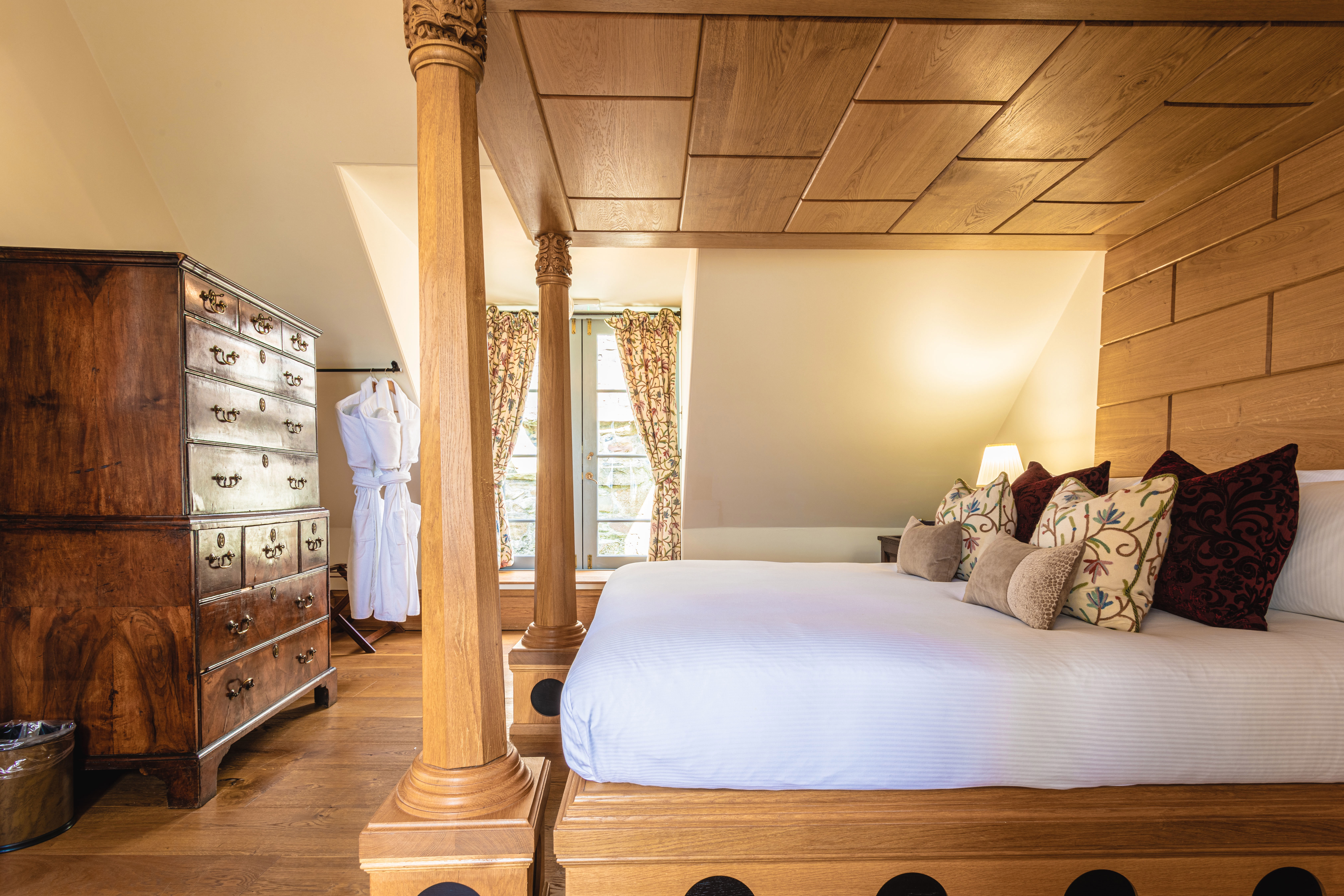 The MacIain Suite is ideal for those looking for a feast of Georgian extravagance. Its super-king-sized antique four-poster bed is the centrepiece of the room, set amongst half-height oak panelling and hand-sewn crewel fabric.