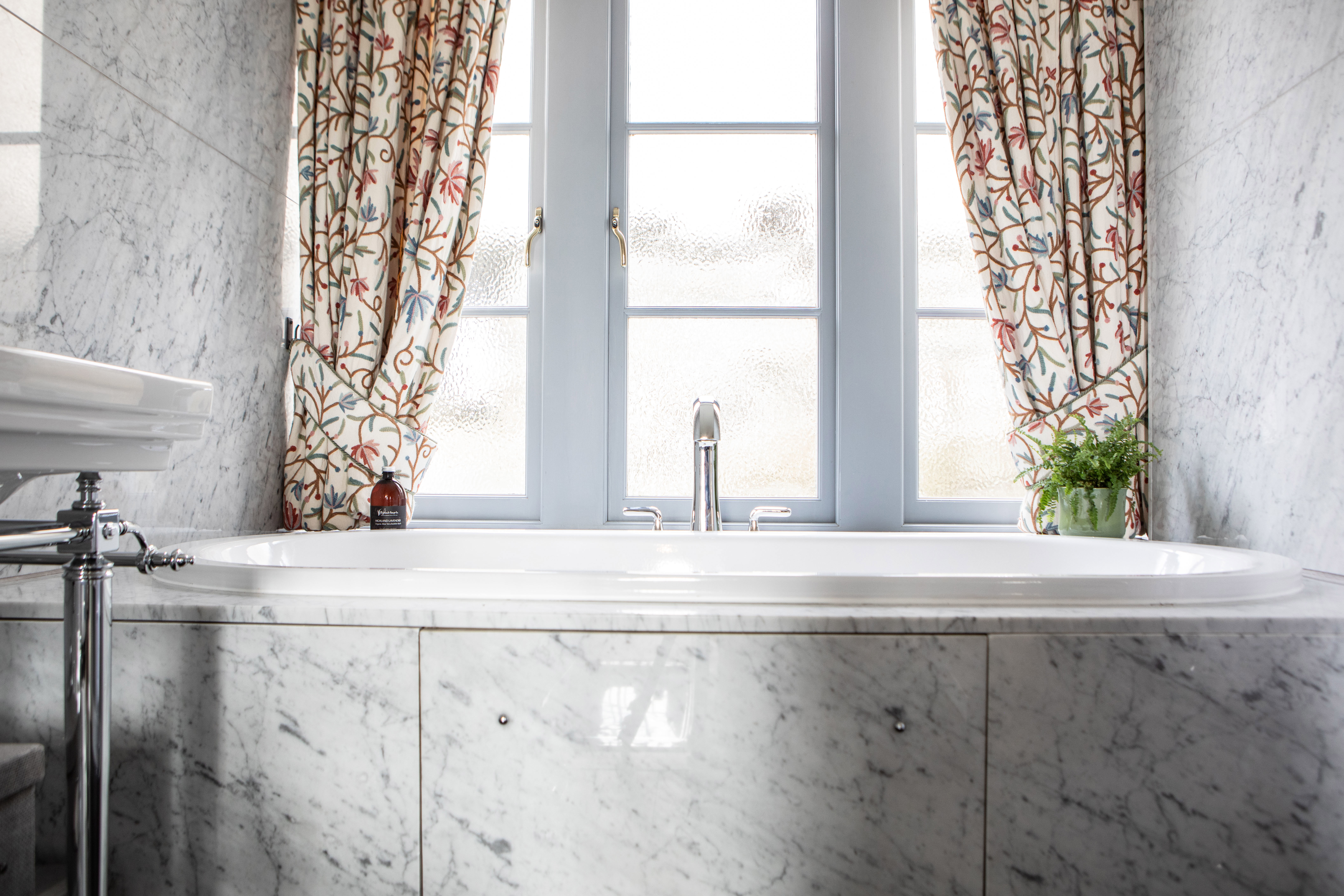 Lined with Italian marble, the family bathroom features a freestanding shower enclosure and bath for two, with windows that make for the perfect stargazing spot.
