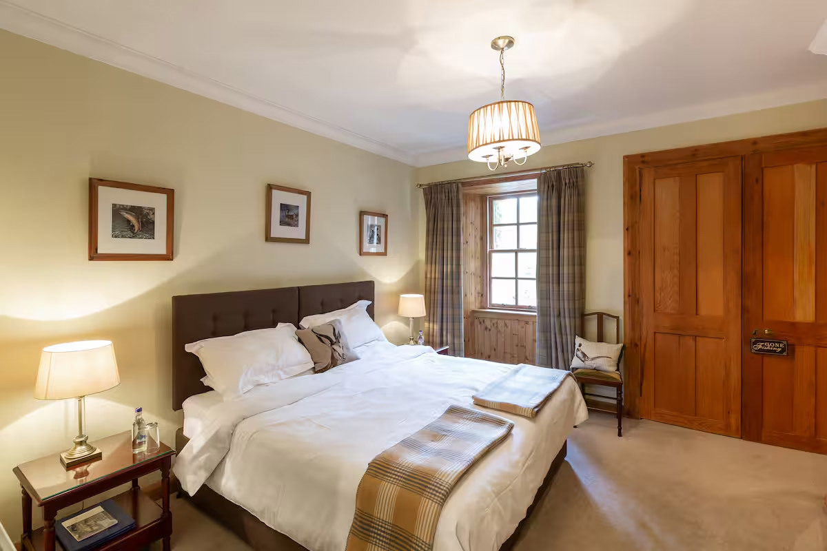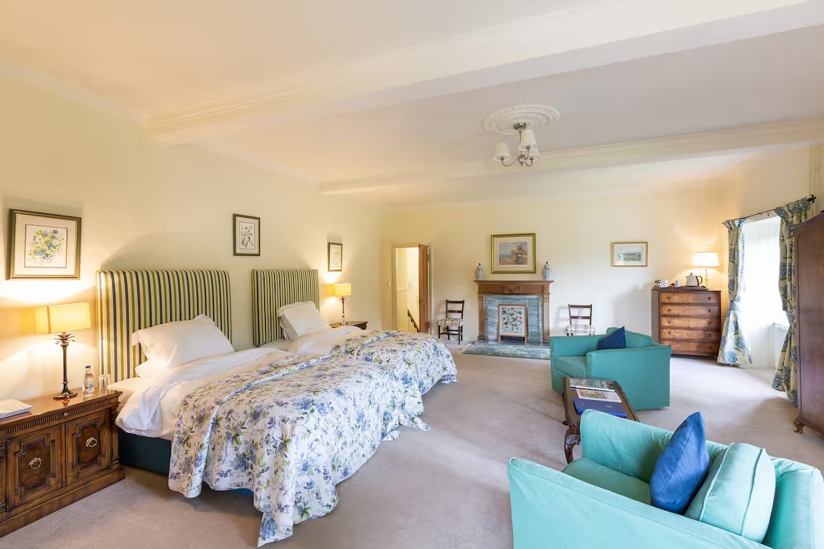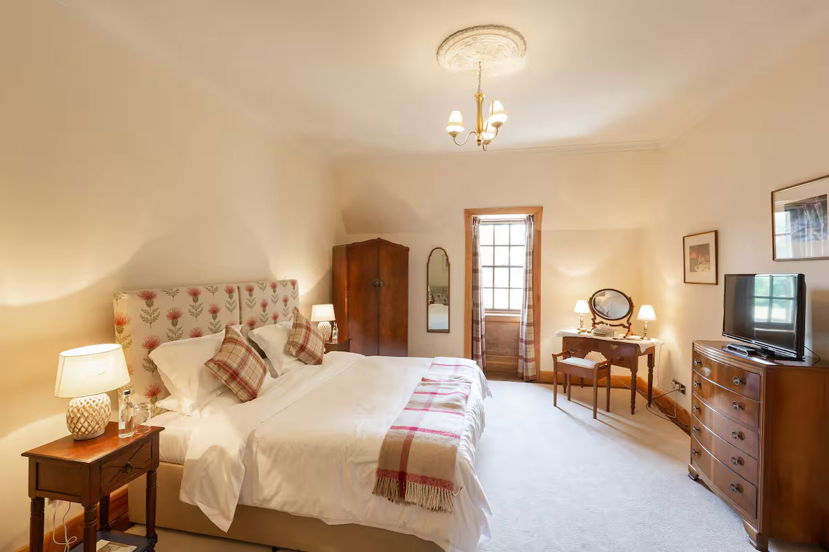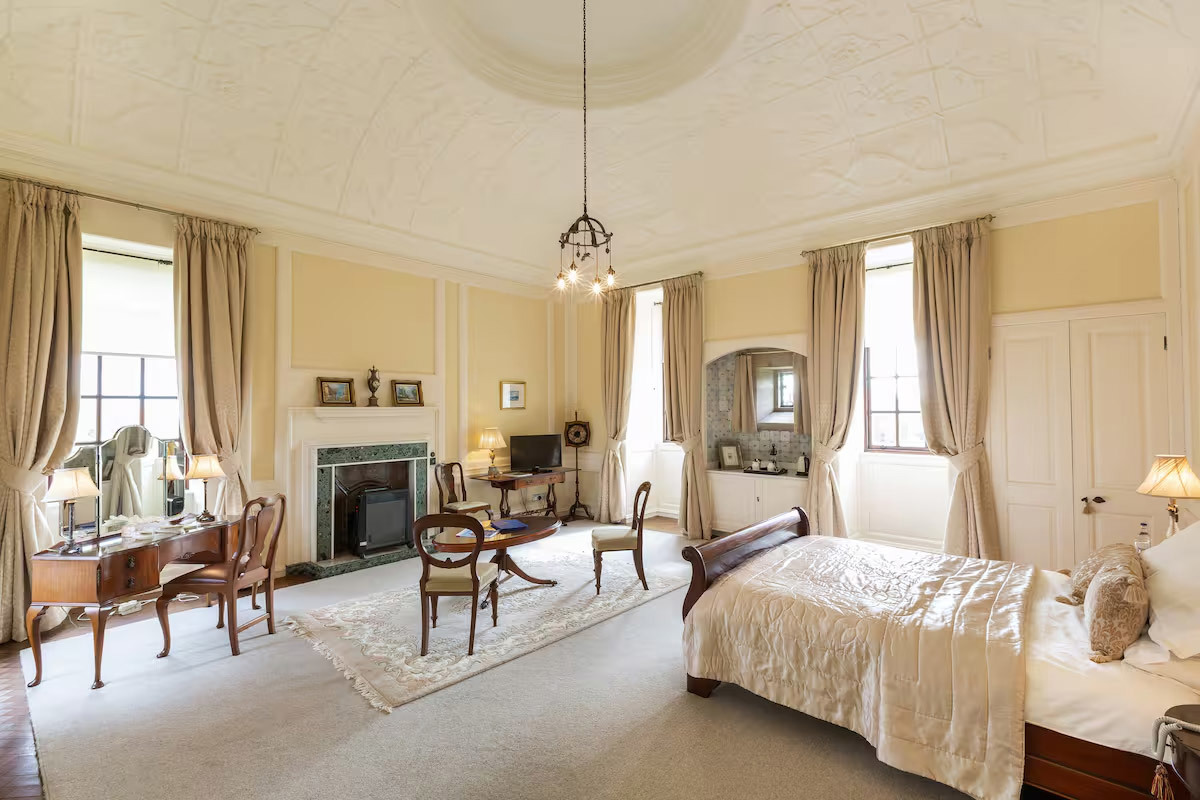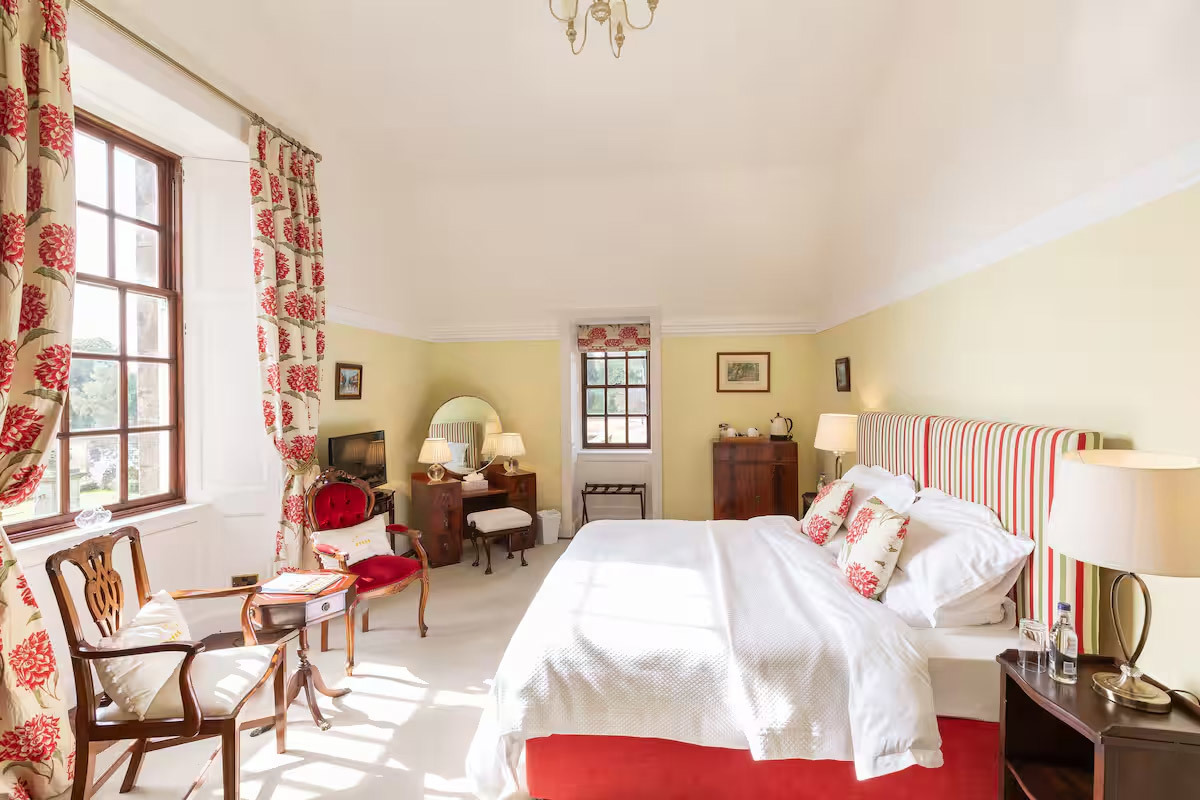 Rowallan Castle sleeps 21 guests in eleven luxurious and characterfully named bedroom suites, each uniquely styled and lavished with attention to detail. The historic rooms feature wooden beams and original stone walls, complemented by a stylish and elegant décor that creates a timeless appeal.