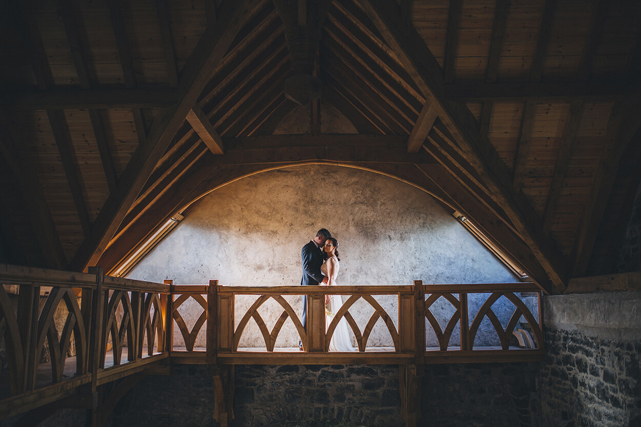 Should you choose to marry indoors, your ceremony will take place within the castle's atmospheric chapel on the ground floor of the beautifully restored Tower House. Here, simplicity speaks volumes - soaring exposed stone walls curve gracefully overhead, while wooden pews, soft uplighting and a hanging tapestry create a setting that feels timeless and deeply romantic.
