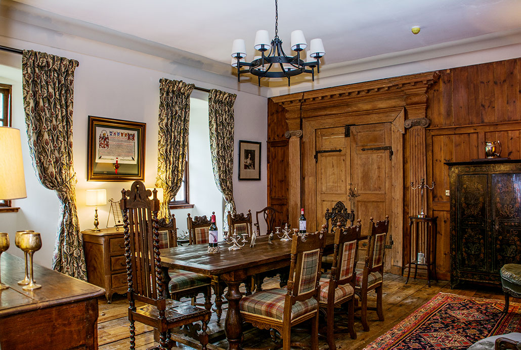 An ornate wooden table and chairs take centre stage here and catch the light through the windows. This room has a traditional country manor air about it and is enticingly cosy with its thick curtains, tartan upholstery and antique style rugs over original floorboards.