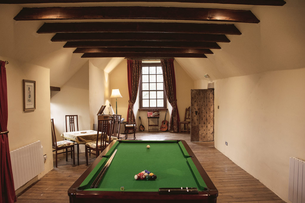 A snug room with a sumptuous corner settee below original wooden beams welcomes your cosy group to have fun and make some memories over a bottle of wine and before a warming fireplace. At the other end of the room is space for family games and music, featuring a snooker table, chess board, card table, a vinyl player and various musical instruments.
