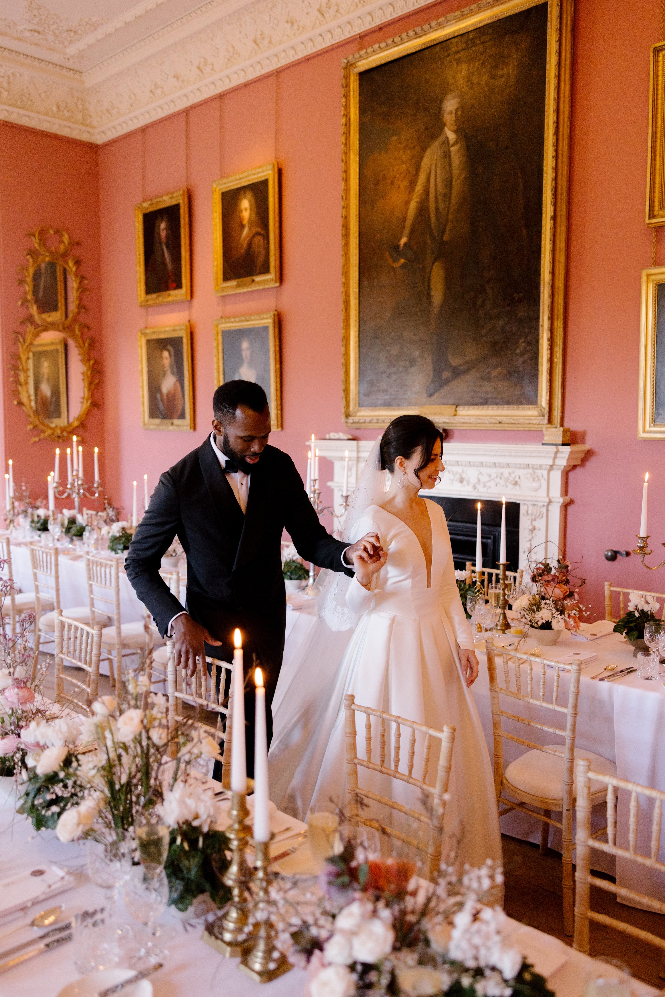 The elegant, richly hued Dining Room, with its gold-framed mirrors, hanging portraits, and beautifully draped windows, hosts up to 100 guests. Candelabras woven with foliage stretch along the tables, with dappled light glistening on crystal glassware and silver cutlery, illuminating the exquisite plasterwork ceiling above. Combined with the adjoining room, the castle can accommodate up to 120 dining guests.