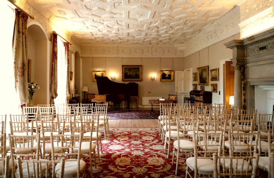 Winton Castle can host civil, humanist or religious ceremonies in the intimate Drawing Room for up to 100 guests. The Drawing Room features a grand piano, magnificent fireplace, and ornate ceiling, exudes sophistication. French doors open onto a balcony with sweeping views of the loch, terraced gardens and surrounding estate.
