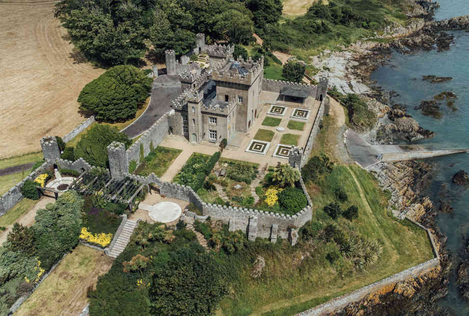 Enclosed by neat battlements and tree-dotted fields beyond, this cliff-edge castle, featuring impressive crenelations across its entirety, occupies a rugged landscape position just metres from the wild Irish Sea. Its grounds combine sculpture, gardens and a private beach, whilst its interiors portray a traditional country elegance across a canvas of complementary colours, intricate prints and dark wood.