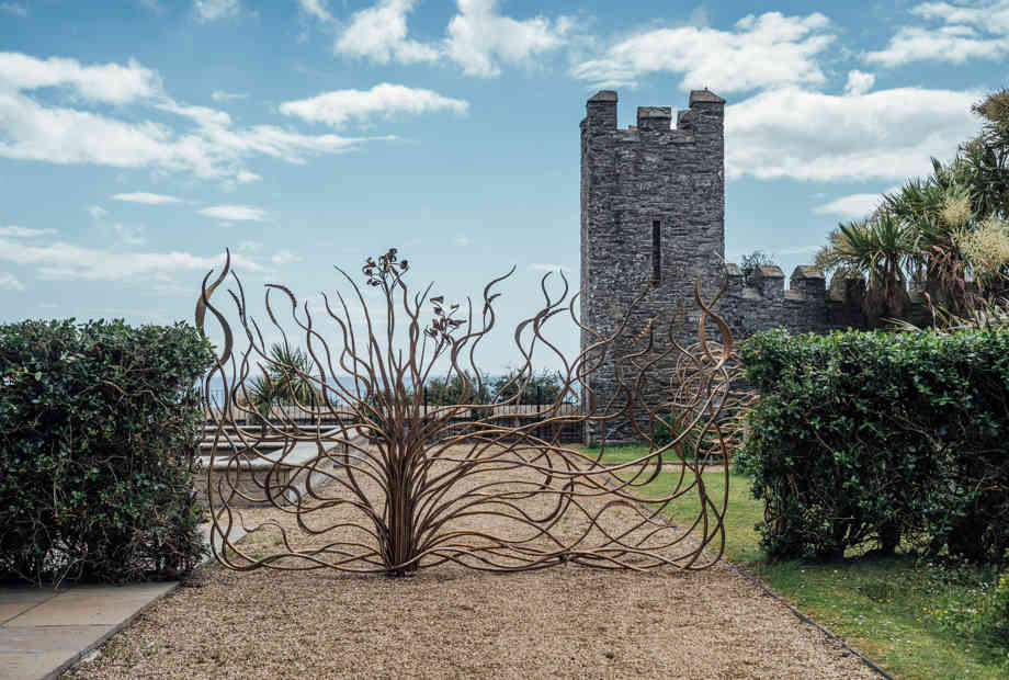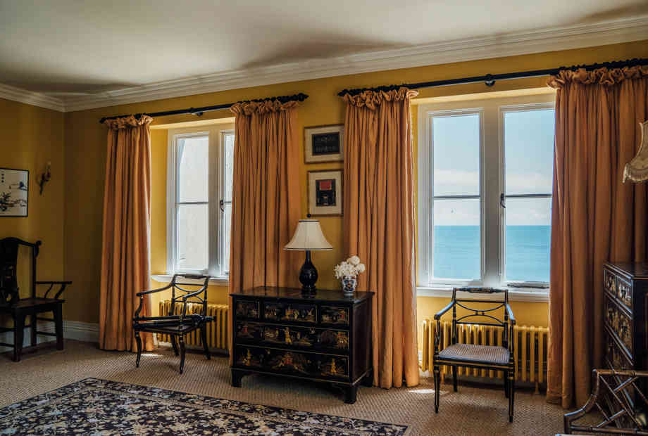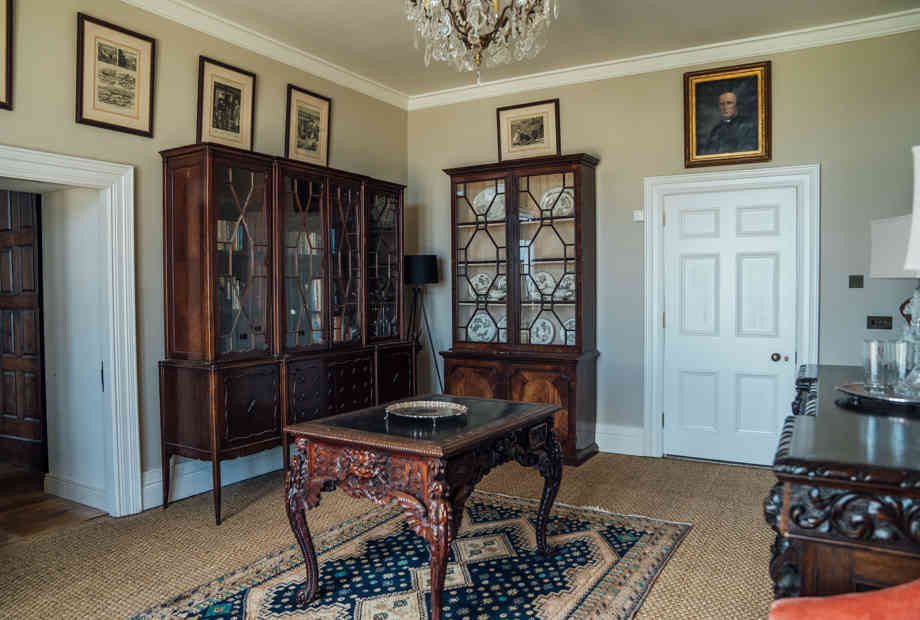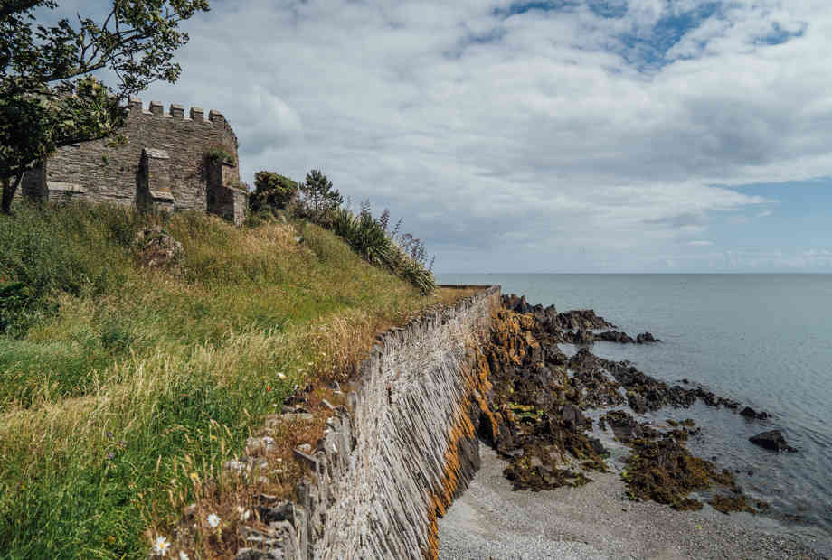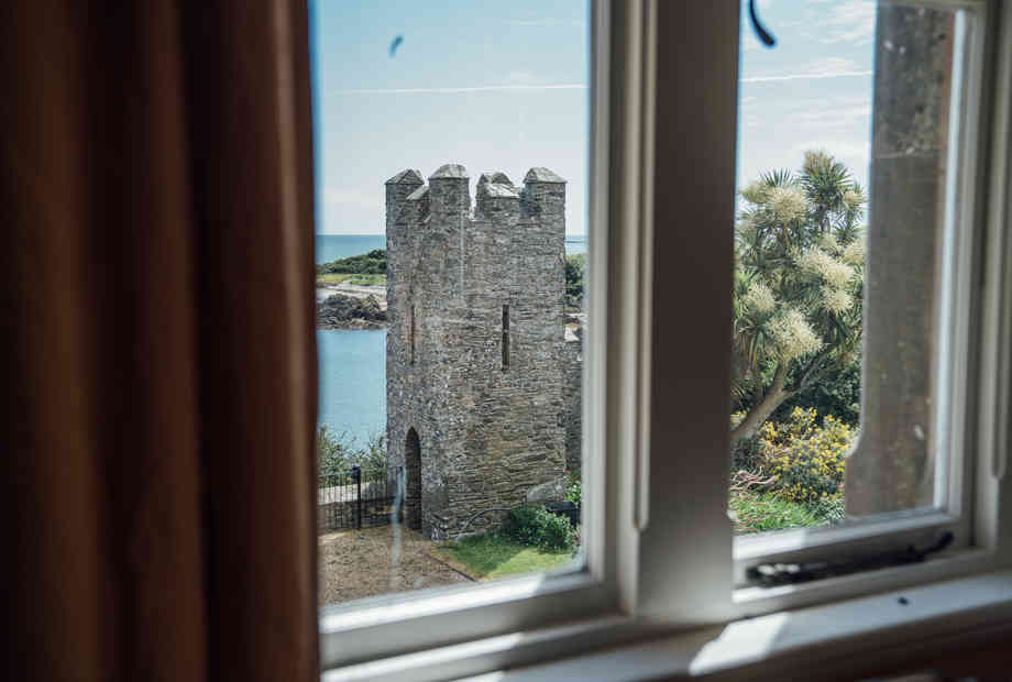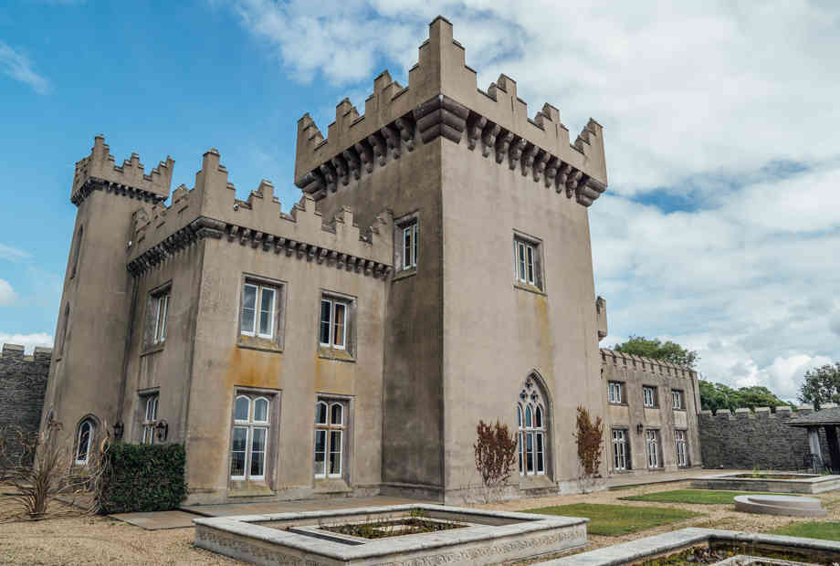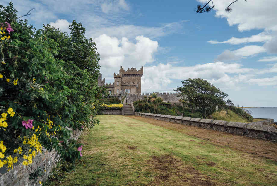 Enclosed by neat battlements and tree-dotted fields beyond, this cliff-edge castle, featuring impressive crenelations across its entirety, occupies a rugged landscape position just metres from the wild Irish Sea. Its grounds combine sculpture, gardens and a private beach, whilst its interiors portray a traditional country elegance across a canvas of complementary colours, intricate prints and dark wood.