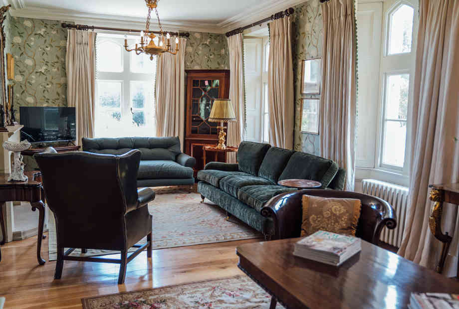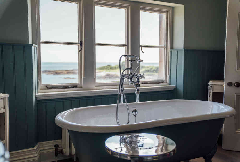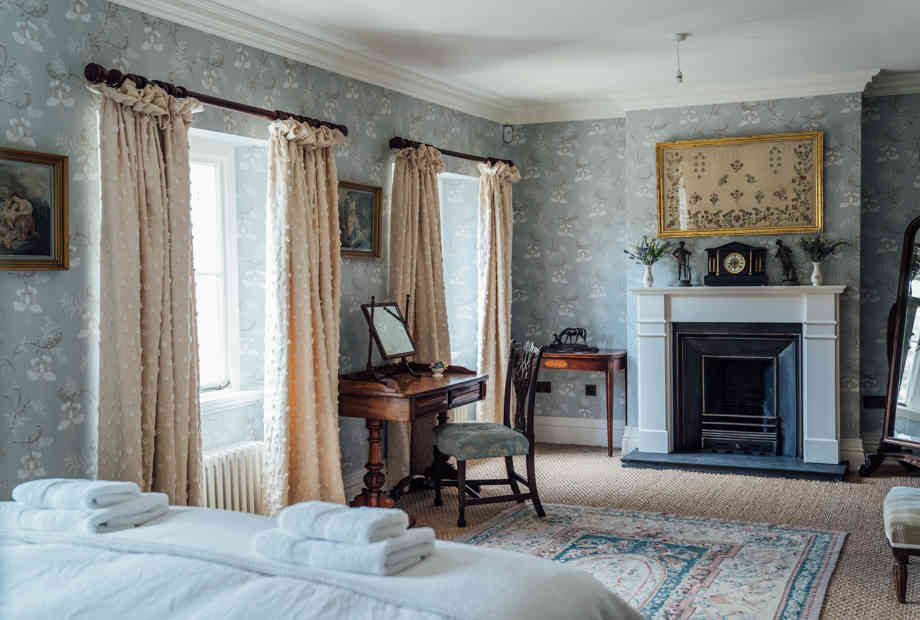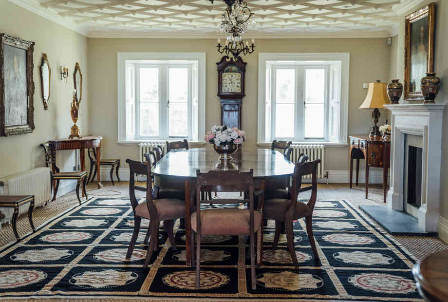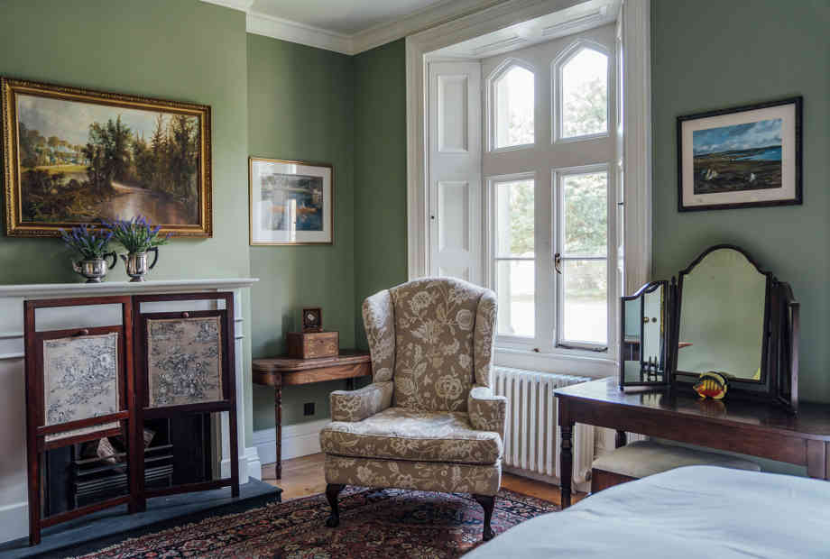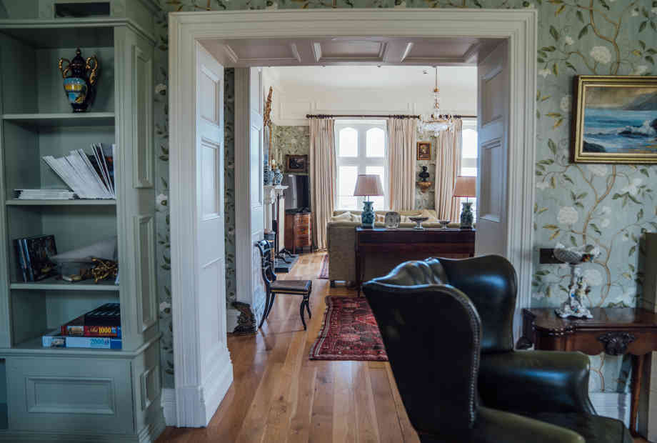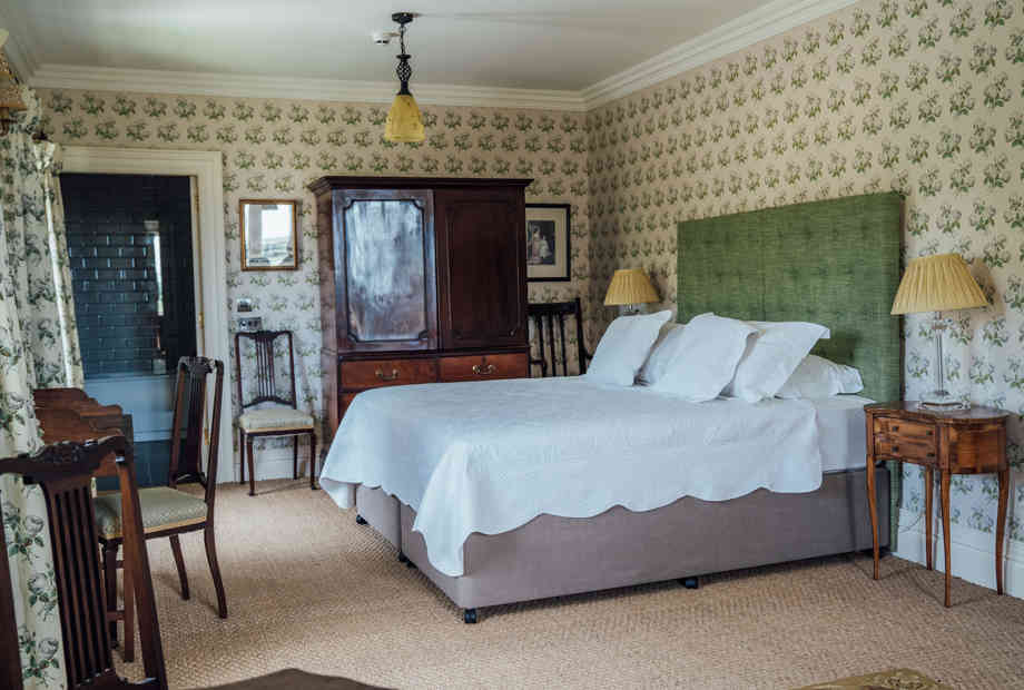 Enclosed by neat battlements and tree-dotted fields beyond, this cliff-edge castle, featuring impressive crenelations across its entirety, occupies a rugged landscape position just metres from the wild Irish Sea. Its grounds combine sculpture, gardens and a private beach, whilst its interiors portray a traditional country elegance across a canvas of complementary colours, intricate prints and dark wood.